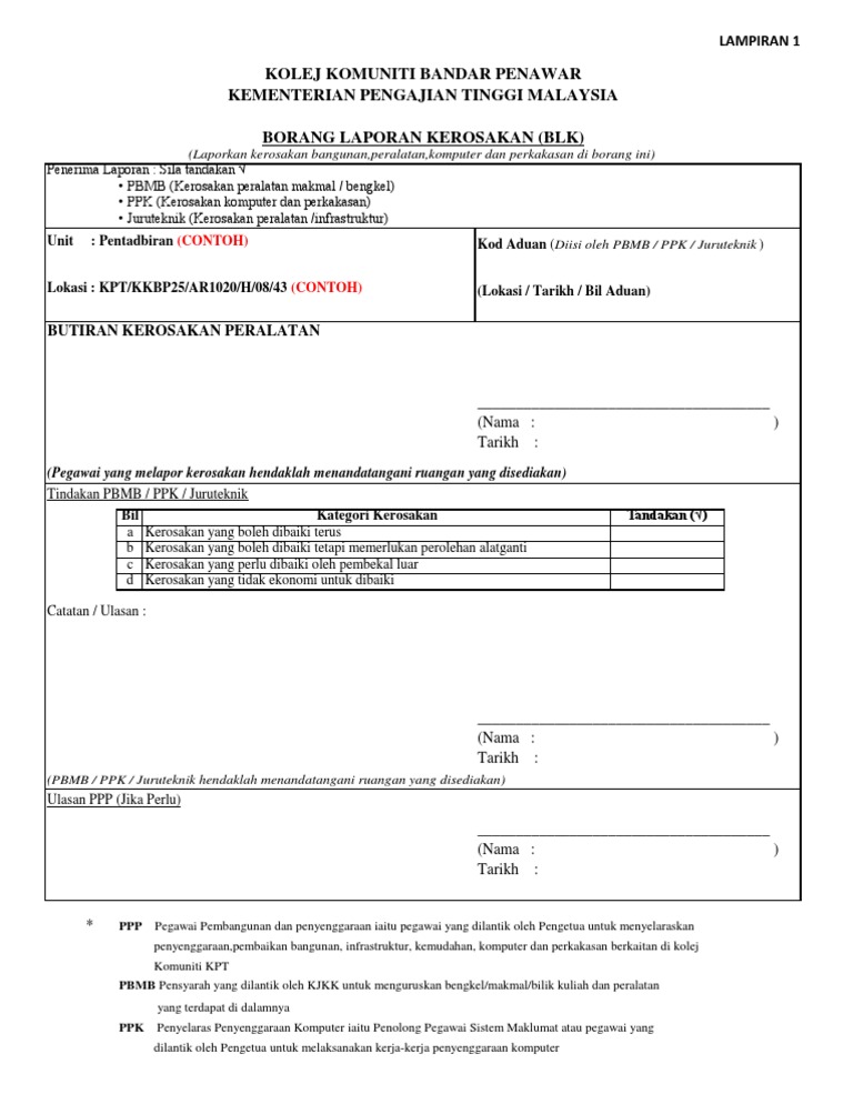 Borang aduan kerosakan rumah/ flat. Menyemak senarai rekod kerosakan bagi mengetahui jenis kerosakan. Tarikh dan masa aduan dibuat. Borang aduan kerosakan from alif naqiuddin. .syarikat pembantu juruteknik perlu mengisi borang aduan kerosakan komputer borang ini kemudian akan dihantar ke unit/jabatan 4 tujuan klasifikasikan kerosakan mudahkan rujukan untuk diserahkan kepada jabatan berkenaan untuk proses baikpulih maklumat peribadi.