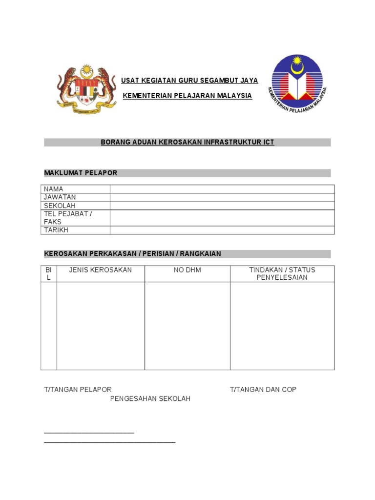 Microsoft word document 40.5 kb. Tarikh dan masa aduan dibuat. Aduan borang aduan kerosakan perkakasan/perisian ict. Free & easy!app builder no coding! Borang aduan /kerosakan komputer sila lengkapkan borang ini dan serahkan kepada unit khidmat komputer tugasan akan dilaksana mengikut keutamaan. Banyak habuk di cpu fan. Pengisian borang aduan kerosakan secara manual kini boleh dilakukan secara online. Borang aduan masalah/ kerosakan ict. Borang aduan kerosakan from alif naqiuddin. Rekodkan aduan kerosakan di dalam buku log kerosakan peralatan ict sekolah dengan butiran berikut: Tarikh aduan bahagian / unit. Maklumat kerosakan (diisi oleh pelapor) kategori masalah jenis perkakasan/aplikasi terlibat perkakasan. Borang aduan kerosakan rumah/ flat.