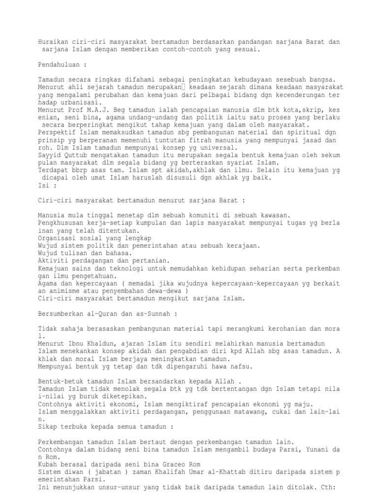 Ciri-Ciri Masyarakat Bertamadun Dalam Konteks Tamadun Malaysia. - Sebagaimana telah kita ketahui bahwa masyarakat madani terdiri dari dua kata, yaitu 'masyarakat' dan 'madani'.. Perubahan ini bergantung pada pencapaian keilmuan dan kekuatan rohaniah mereka. Bahasa dan sistem tulisan yang maju. Doc soalan bad 1 siti khadijah academia edu. Tamadun secara ringkas difahami sebagai peningkatan kebudayaan sesebuah bangsa. Masyarakat dalam tamadun awal mempercayai animisme.